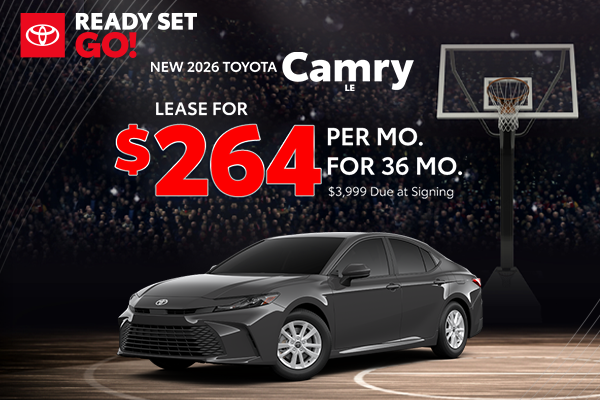 Lease example based on a 2026 Toyota Camry LE (Model 2559). VIN: 4T1DAACK2TU269644. MSRP: $32,817. $264 per month lease for 36 months. With approved credit through Toyota Financial Services. 10,000 miles per year. $3,999 due at signing. Not all will qualify. Security deposit not required. On select models. 12 available in stock. Advertised Price EXCLUDES all optional dealer offered items, accessories, or product addendums optionally selected by the purchaser, applicable official taxes and fees, and a $436 documentary fee. See dealer for details. Offer Expires 03/31/2026.