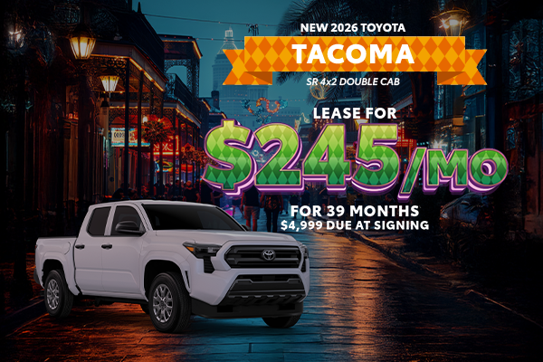 Lease example based on a 2026 Toyota Tacoma SR RWD 4x2 Double Cab 2.4L 4-Cyl Turbo. Stock: TT44064. TSRP: $36,695. $245 per month lease for 39 months. With approved Credit through Toyota Financial Services. 10,000 miles per year. $4,999 due at signing. Excludes 2WD Double Cab TRD SPORT L4 8AT, 4WD Double Cab TRD SPORT L4 6MT, 2WD Extra Cab TRD PRERUN L4 8AT, 4WD Double Cab LIMITED L4 8AT, 4WD Double Cab TRD OFF RD L4 6MT, 4WD Double Cab TRD OFF RD L4 8AT, 4WD Double Cab TRD OFF RD L4 8AT, 2WD Double Cab TRD SPORT L4 8AT, 4WD Double Cab TRD SPORT L4 8AT, 4WD Double Cab TRD SPORT L4 8AT. Advertised Price EXCLUDES all optional dealer offered items, accessories, or product addendums optionally selected by the purchaser, applicable official taxes and fees, and a $436 documentary fee. Not all will qualify. Security deposit not required. On select models. 3 available at this price: Stock: TT024784, TT024959, TT044064. See dealer for details. Offer Expires 03/02/2026.
