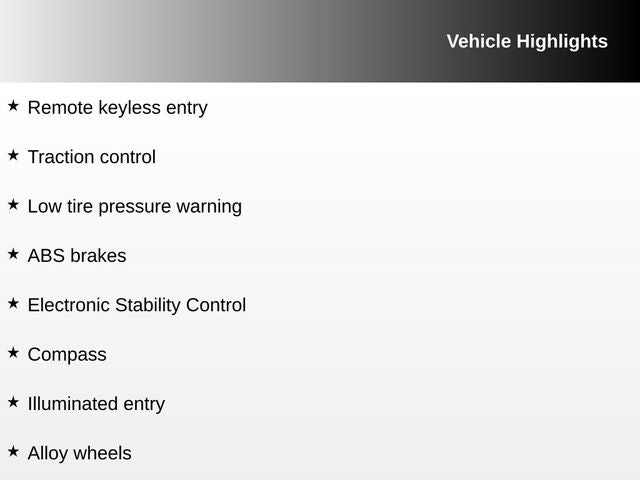 ABS brakes, Alloy wheels, Compass, Electronic Stability Control, Illuminated entry, Low tire pressure warning, Remote keyless entry, Traction control.