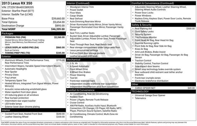 Starfire Pearl 2013 Lexus RX 350 FWD 6-Speed Automatic with Sequential Shift ECT-i 3.5L V6 DOHC Dual VVT-i 24V 18 x 7.5 5-Spoke Aluminum Wheels, 4-Wheel Disc Brakes, 4.398 Axle Ratio, 9 Speakers, ABS brakes, Air Conditioning, Alloy wheels, AM/FM radio: SiriusXM, Anti-whiplash front head restraints, Auto-dimming door mirrors, Auto-dimming Rear-View mirror, Automatic temperature control, Bluetooth® Hands-Free Phone, Brake assist, Bumpers: body-color, CD player, Compass, Delay-off headlights, Driver door bin, Driver vanity mirror, Dual front impact airbags, Dual front side impact airbags, Electronic Stability Control, Emergency communication system: Safety Connect, Fabric Seat Trim, Four wheel independent suspension, Front anti-roll bar, Front Bucket Seats, Front Center Armrest, Front dual zone A/C, Front fog lights, Front reading lights, Fully automatic headlights, Garage door transmitter: HomeLink, Genuine wood console insert, Genuine wood door panel insert, Heated door mirrors, Illuminated entry, Knee airbag, Low tire pressure warning, Occupant sensing airbag, Outside temperature display, Overhead airbag, Overhead console, Panic alarm, Passenger door bin, Passenger vanity mirror, Power door mirrors, Power driver seat, Power Liftgate, Power passenger seat, Power steering, Power windows, Radio data system, Rear anti-roll bar, Rear reading lights, Rear seat center armrest, Rear side impact airbag, Rear window defroster, Rear window wiper, Remote keyless entry, Security system, Speed control, Speed-sensing steering, Split folding rear seat, Spoiler, Steering wheel mounted audio controls, Tachometer, Telescoping steering wheel, Tilt steering wheel, Traction control, Trip computer, Turn signal indicator mirrors, Variably intermittent wipers.