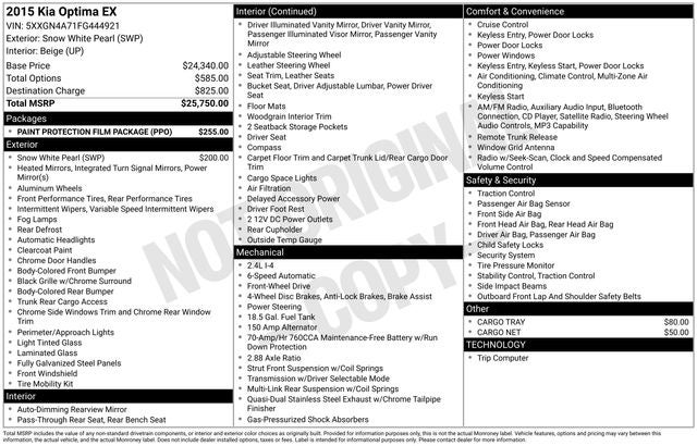 Snow White Pearl 2015 Kia Optima EX FWD 6-Speed Automatic with Sportmatic 2.4L I4 DGI DOHC WE DELIVER ANYWHERE, Beige Leather, 17 Alloy Wheels, 4-Wheel Disc Brakes, 6 Speakers, ABS brakes, Air Conditioning, Alloy wheels, AM/FM radio: SiriusXM, AM/FM/CD/MP3 Radio, Auto-dimming Rear-View mirror, Automatic temperature control, Brake assist, Bumpers: body-color, Cargo Net, Cargo Tray, CD player, Compass, Delay-off headlights, Driver door bin, Driver vanity mirror, Dual front impact airbags, Dual front side impact airbags, Electronic Stability Control, Four wheel independent suspension, Front anti-roll bar, Front Bucket Seats, Front Center Armrest, Front dual zone A/C, Front fog lights, Front reading lights, Fully automatic headlights, Heated door mirrors, Illuminated entry, Leather Seat Trim, Low tire pressure warning, Occupant sensing airbag, Outside temperature display, Overhead airbag, Overhead console, Paint Protection Film Package, Panic alarm, Passenger door bin, Passenger vanity mirror, Power door mirrors, Power driver seat, Power steering, Power windows, Rear anti-roll bar, Rear reading lights, Rear seat center armrest, Rear window defroster, Remote keyless entry, Security system, Speed control, Speed-sensing steering, Split folding rear seat, Steering wheel mounted audio controls, Tachometer, Telescoping steering wheel, Tilt steering wheel, Traction control, Trip computer, Turn signal indicator mirrors, Variably intermittent wipers, Beige Leather.