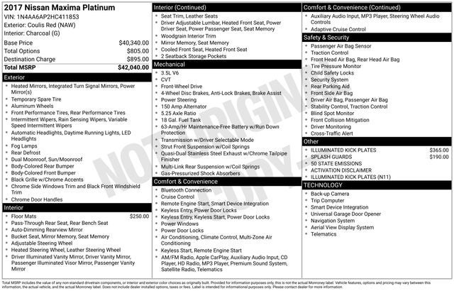 - Radio: AM/FM/HD/CD Audio System -inc: MP3/WMA reader, Bose sound system, 11 speakers, NissanConnect w/Navigation featuring Apple CarPlay, SiriusXM satellite radio, auxiliary audio input jack and Nissan Connect Services