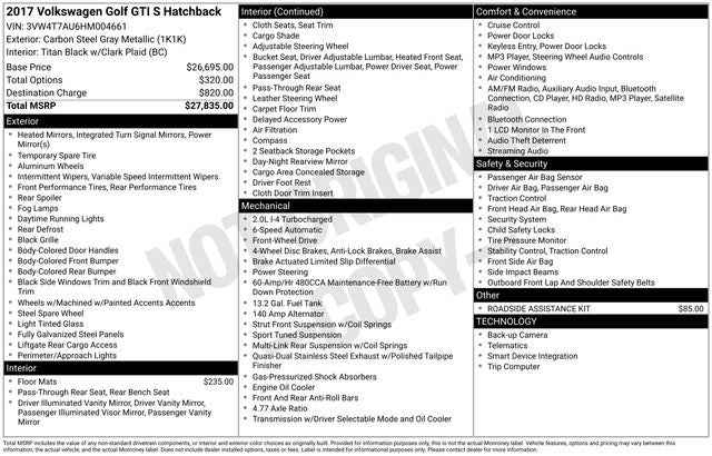 Steel Gray Metallic 2017 Volkswagen Golf GTI S FWD 6-Speed DSG Automatic with Tiptronic 2.0L TSI 4-Wheel Disc Brakes, 8 Speakers, ABS brakes, Air Conditioning, Alloy wheels, AM/FM radio: SiriusXM, Anti-whiplash front head restraints, Brake assist, Bumpers: body-color, CD player, Cloth Seating Surfaces, Compass, Driver door bin, Driver vanity mirror, Dual front impact airbags, Dual front side impact airbags, Electronic Stability Control, Emergency communication system: VW Car-Net, Exterior Parking Camera Rear, Four wheel independent suspension, Front anti-roll bar, Front Bucket Seats, Front Center Armrest, Front fog lights, Front reading lights, GTI Rubber Mats Kit, Heated door mirrors, Heated front seats, Heated Top Sport Front Seats, Illuminated entry, Leather Shift Knob, Leather steering wheel, Low tire pressure warning, Occupant sensing airbag, Outside temperature display, Overhead airbag, Overhead console, Panic alarm, Passenger door bin, Passenger vanity mirror, Power door mirrors, Power driver seat, Power passenger seat, Power steering, Power windows, Radio data system, Radio: Composition Media w/6.5 Touchscreen, Rear anti-roll bar, Rear reading lights, Rear seat center armrest, Rear window defroster, Rear window wiper, Remote keyless entry, Roadside Assistance Kit, Security system, Speed control, Speed-sensing steering, Split folding rear seat, Spoiler, Sport steering wheel, Steering wheel mounted audio controls, Tachometer, Telescoping steering wheel, Tilt steering wheel, Traction control, Trip computer, Turn signal indicator mirrors, Variably intermittent wipers, Wheels: 18 Austin Alloy.