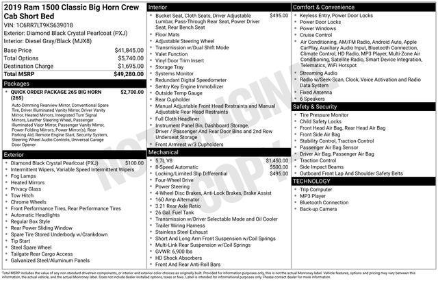 Whether you're hauling heavy loads, navigating busy city streets, or embarking on off-road adventures, this 2019 Ram 1500 Classic Big Horn is the perfect companion. Experience the perfect blend of power, capability, and comfort that this exceptional vehicle has to offer. Visit our showroom today and let us demonstrate how this Ram 1500 Classic can elevate your driving experience.