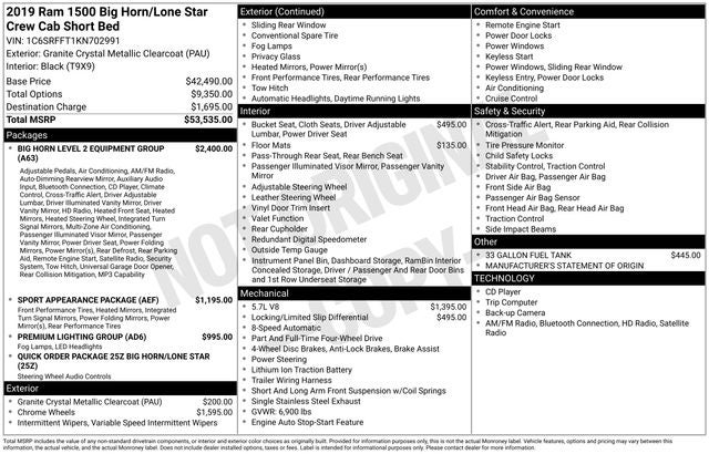 Granite Crystal Metallic Clearcoat 2019 Ram 1500 Big Horn/Lone Star 4WD 8-Speed Automatic HEMI 5.7L V8 Multi Displacement VVT WE DELIVER ANYWHERE, 115V Auxiliary Power Outlet, 115V Auxiliary Rear Power Outlet, 2 USB Full Function/Charge Only Media Hub, 400W Inverter, 8.4 Touchscreen Display, Air Conditioning ATC w/Dual Zone Control, Auto-Dimming Exterior Driver Mirror, Auto-Dimming Rear-View Mirror, Big Horn IP Badge, Big Horn Level 2 Equipment Group, Black Interior Accents, Body Color Door Handles, Body Color Front Bumper, Body Color Rear Bumper w/Step Pads, Class IV Receiver Hitch, Cluster 7.0 TFT Color Display, Dampened Tailgate, Deluxe Cloth Bucket Seats, Exterior Mirrors Courtesy Lamps, Exterior Mirrors w/Memory, Exterior Mirrors w/Supplemental Signals, Foam Bottle Insert (Door Trim Panel), Front LED Fog Lamps, Glove Box Lamp, Grille B/Color Outline 1 Texture 2, Heated Front Seats, Heated Steering Wheel, Integrated Center Stack Radio, LED Reflector Headlamps, LED Taillamps, ParkSense Front/Rear Park Assist w/Stop, Power 4-Way Driver Lumbar Adjust, Power 8-Way Driver Seat, Power Adjustable Pedals, Power Heated Fold Away Mirrors, Power Heated Fold-Away Mirrors, Power-Folding Mirrors, Premium Lighting Group, Quick Order Package 25Z Big Horn/Lone Star, Radio: Uconnect 4 w/8.4 Display, Rear Dome w/On/Off Switch Lamp, Rear Power Sliding Window, Rear Window Defroster, Remote Start System, Security Alarm, Single Disc Remote CD Player, SiriusXM Satellite Radio, Sport Appearance Package, Steering Wheel Mounted Audio Controls, Sun Visors w/Illuminated Vanity Mirrors, Universal Garage Door Opener, 3 Rear Seat Head Restraints, 3.21 Rear Axle Ratio, 33 Gallon Fuel Tank, 4 Way Front Headrests, 4-Wheel Disc Brakes, 48V Belt Starter Generator, 6 Speakers, ABS brakes, Air Conditioning, Alloy wheels, AM/FM radio, Anti-Spin Differential Rear Axle, Brake assist, Bucket Seats, Bumpers: chrome, Center Console Parts Module, Cloth Bench Seat, Compass, Delay-off headlights, Driver door bin, Dual front impact airbags, Dual front side impact airbags, Electronic Stability Control, Front & Rear Rubber Floor Mats, Front anti-roll bar, Front Center Armrest w/Storage, Front fog lights, Front reading lights, Front Seat Back Map Pockets, Front wheel independent suspension, Full Length Floor Console, Fully automatic headlights, GPS Antenna Input, Heated door mirrors, Illuminated entry, Leather steering wheel, Low tire pressure warning, Manual Adjust 4-Way Front Passenger Seat, Manufacturer's Statement of Origin, Occupant sensing airbag, Outside temperature display, Overhead airbag, Overhead console, Panic alarm, ParkView Rear Back-Up Camera, Passenger door bin, Passenger vanity mirror, Power door mirrors, Power steering, Power windows, Radio data system, Radio: Uconnect 3 w/5 Display, Rear 60/40 Folding Seat, Rear anti-roll bar, Rear seat center armrest, Rear step bumper, Remote keyless entry, Speed control, Split folding rear seat, Tachometer, Telescoping steering wheel, Tilt steering wheel, Traction control, Trip computer, Variably intermittent wipers, Voltmeter, Wheels: 18 x 8, Wheels: 20 x 9 Aluminum Chrome Clad, 115V Auxiliary Power Outlet, 115V Auxiliary Rear Power Outlet, 2 USB Full Function/Charge Only Media Hub, 400W Inverter, 8.4 Touchscreen Display, Air Conditioning ATC w/Dual Zone Control, Auto-Dimming Exterior Driver Mirror, Auto-Dimming Rear-View Mirror, Big Horn IP Badge, Big Horn Level 2 Equipment Group, Black Interior Accents, Body Color Door Handles, Body Color Front Bumper, Body Color Rear Bumper w/Step Pads, Class IV Receiver Hitch, Cluster 7.0 TFT Color Display, Dampened Tailgate, Deluxe Cloth Bucket Seats, Exterior Mirrors Courtesy Lamps, Exterior Mirrors w/Memory, Exterior Mirrors w/Supplemental Signals, Foam Bottle Insert (Door Trim Panel), Front LED Fog Lamps, Glove Box Lamp, Grille B/Color Outline 1 Texture 2, Heated Front Seats, Heated Steering Wheel, Integrated Center Stack Radio, LED Reflector Headlamp