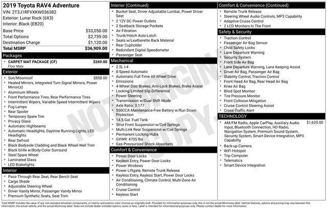 Lunar 2019 Toyota RAV4 Adventure AWD 8-Speed Automatic 2.5L 4-Cylinder DOHC Dual VVT-i 4-Wheel Disc Brakes, 6 Speakers, ABS brakes, Air Conditioning, Alloy wheels, AM/FM radio: SiriusXM, Anti-Theft System, Apple CarPlay, Auto High-beam Headlights, Automatic temperature control, Axle Ratio: 3.177, Brake assist, Bumpers: body-color, Carpet Cargo Mat, Carpet Floor Mats, Carpet Mat Package, Delay-off headlights, Driver door bin, Driver vanity mirror, Dual front impact airbags, Dual front side impact airbags, Electronic Stability Control, Emergency communication system: Entune Safety Connect, Exterior Parking Camera Rear, Four wheel independent suspension, Front anti-roll bar, Front Bucket Seats, Front Center Armrest, Front dual zone A/C, Front fog lights, Front reading lights, Fully automatic headlights, Heated door mirrors, Illuminated entry, Knee airbag, Low tire pressure warning, Moon Roof, Occupant sensing airbag, Outside temperature display, Overhead airbag, Overhead console, Panic alarm, Passenger door bin, Passenger vanity mirror, Power door mirrors, Power driver seat, Power Liftgate, Power steering, Power windows, Radio data system, Radio: Entune 3.0 Audio Plus, Radio: Entune 3.0 Premium Audio w/JBL/Clari-Fi, Rear anti-roll bar, Rear seat center armrest, Rear window defroster, Rear window wiper, Remote keyless entry, Roof rack: rails only, Security system, SofTex Seat Trim, Speed control, Speed-sensing steering, Split folding rear seat, Spoiler, Steering wheel mounted audio controls, Tachometer, Telescoping steering wheel, Tilt steering wheel, Traction control, Trip computer, Turn signal indicator mirrors, Variably intermittent wipers, Wheels: 19 x 7.5J Alloy.