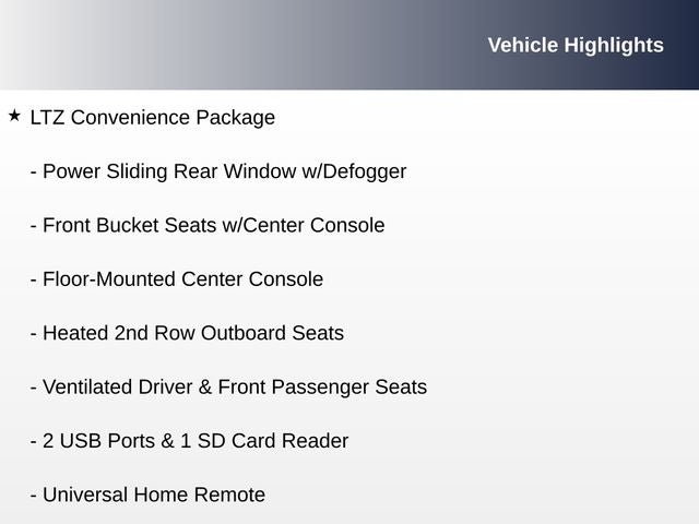 - Seats, front 40/20/40 split-bench with covered armrest storage and under-seat storage (lockable) (Not available with (PCZ) LTZ Convenience Package, (PDF) LTZ Plus Package, (PDK) LTZ Premium Package or (PDL) LTZ Texas Edition.)