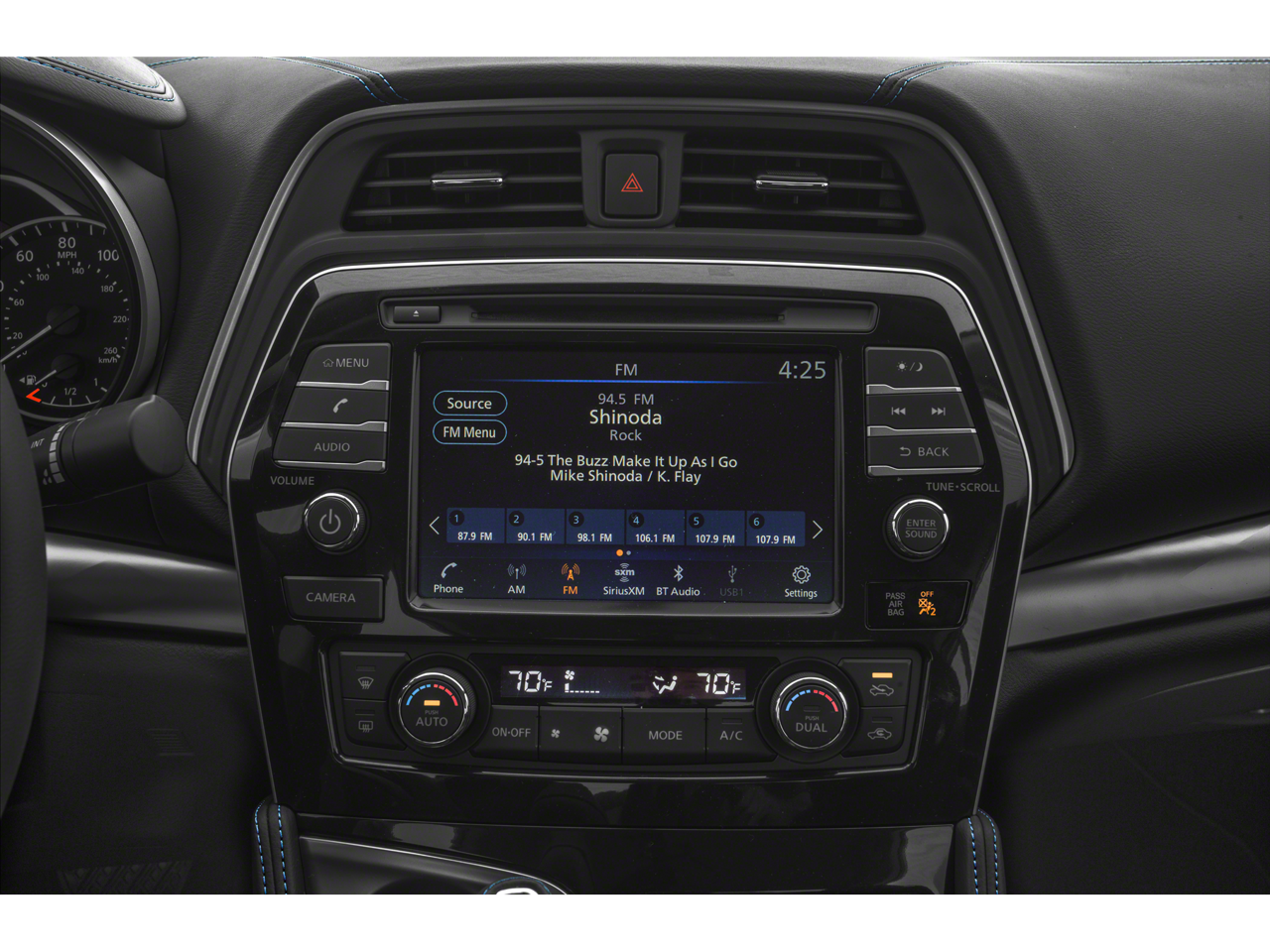 - Radio: AM/FM/CD Audio System w/Navigation -inc: MP3/WMA reader, NissanConnect w/navigation featuring Apple CarPlay and Android Auto, 8" color display w/multi-touch control, 2 front illuminated USB connection ports (1 Type-A, 1 Type-C) for iPod interface and other compatible devices, Bluetooth® hands-free phone system, streaming audio via Bluetooth®, hands-free text messaging assistant, SiriusXM satellite w/advanced audio features, auxiliary audio input jack, Nissan door to door navigation w/3D building graphics and satellite imagery, connected navigation features including online POI search, door-to-door navigation, and online premium traffic information, HD radio, SiriusXM Travel Link (weather, fuel prices, movie listings, stock info, sports and parking), SiriusXM Traffic, 11 speaker Bose sound system and 2 rear illuminated USB charge ports (1 Type-A, 1 Type-C)