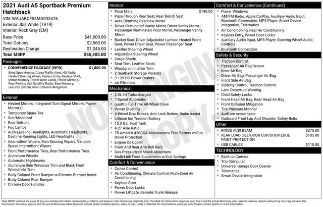 Clean CARFAX. Ibis White 2021 Audi A5 40 Premium quattro quattro 7-Speed Automatic S tronic 2.0L 4-Cylinder TFSI ABS brakes, Alloy wheels, Compass, Electronic Stability Control, Front Bucket Seats, Front Center Armrest, Front dual zone A/C, Heated door mirrors, Heated front seats, Heated Front Sport Seats, Illuminated entry, Low tire pressure warning, Power Liftgate, Power moonroof, Power passenger seat, Remote keyless entry, Split folding rear seat, Traction control.