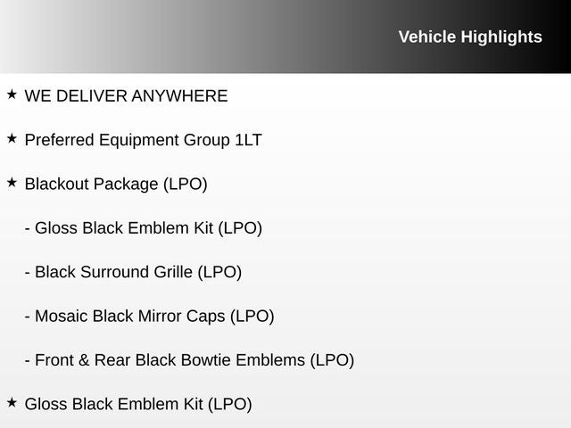 Nightfall Gray Metallic 2021 Chevrolet Equinox LT FWD 6-Speed Automatic Electronic with Overdrive 1.5L DOHC WE DELIVER ANYWHERE, Black Surround Grille (LPO), Blackout Package (LPO), Front & Rear Black Bowtie Emblems (LPO), Gloss Black Emblem Kit (LPO), Mosaic Black Mirror Caps (LPO), Preferred Equipment Group 1LT, 17 Aluminum Wheels, 2 Rear USB Charging-Only Ports, 2 USB Ports & Auxiliary Input Jack, 2-Way Power Driver Lumbar Control Seat Adjuster, 3.50 Final Drive Axle Ratio, 4-Wheel Disc Brakes, 6 Speaker Audio System Feature, 6 Speakers, 8-Way Power Driver Seat Adjuster, ABS brakes, Air Conditioning, Alloy wheels, AM/FM radio: SiriusXM, Apple CarPlay/Android Auto, Auto High-beam Headlights, Bluetooth® For Phone, Brake assist, Bumpers: body-color, Compass, Delay-off headlights, Driver door bin, Driver vanity mirror, Dual front impact airbags, Dual front side impact airbags, Electronic Stability Control, Emergency communication system: OnStar and Chevrolet connected services capable, Four wheel independent suspension, Front anti-roll bar, Front Bucket Seats, Front Center Armrest, Front Passenger 4-Way Manual Seat Adjuster, Front reading lights, Fully automatic headlights, Heated door mirrors, High-Intensity Discharge Headlights, Illuminated entry, Low tire pressure warning, Occupant sensing airbag, Outside temperature display, Overhead airbag, Overhead console, Panic alarm, Passenger door bin, Passenger vanity mirror, Power door mirrors, Power driver seat, Power steering, Power windows, Premium audio system: Chevrolet Infotainment 3, Premium Cloth Seat Trim, Radio data system, Radio: Chevrolet Infotainment 3 System w/AM/FM, Rear anti-roll bar, Rear reading lights, Rear seat center armrest, Rear window defroster, Rear window wiper, Remote keyless entry, Security system, SiriusXM Radio, Speed control, Speed-sensing steering, Split folding rear seat, Spoiler, Steering wheel mounted audio controls, Tachometer, Telescoping steering wheel, Tilt steering wheel, Traction control, Trip computer, Variably intermittent wipers, Black Surround Grille (LPO), Blackout Package (LPO), Front & Rear Black Bowtie Emblems (LPO), Gloss Black Emblem Kit (LPO), Mosaic Black Mirror Caps (LPO), Preferred Equipment Group 1LT.