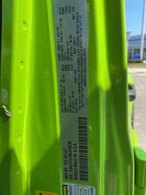 1-Year SiriusXM Guardian Trial, 110 mph Vehicle Max Speed Calibration, 240 Amp Alternator, 3.73 Rear Axle Ratio, 4-Wheel Disc Brakes, 400W Inverter, 5-Year SiriusXM Traffic Service, 5-Year SiriusXM Travel Link Service, 8 Speakers, 8.4 Radio & Premium Audio Group, 8.4 Touchscreen Display, ABS brakes, Air Conditioning, Alloy wheels, Alpine Premium Audio System, AM/FM radio: SiriusXM, Apple CarPlay/Android Auto, Auto-Dimming Rear-View Mirror, Automatic temperature control, Black 3-Piece Hard Top, Body Color 3-Piece Hard Top, Brake assist, Class IV Hitch Receiver, Cold Weather Group, Compass, Corning Gorilla Glass, Delay-off headlights, Driver door bin, Driver vanity mirror, Dual front impact airbags, Dual front side impact airbags, Electronic Stability Control, Emergency/Assistance Call, For Details, Visit DriveUconnect.com, Freedom Panel Storage Bag, Front anti-roll bar, Front Bucket Seats, Front Center Armrest w/Storage, Front dual zone A/C, Front fog lights, Front reading lights, Full Length Floor Console Premium Armrest, Fully automatic headlights, Garage door transmitter, GPS Navigation, HD Radio, Heated door mirrors, Heated Front Seats, Heated Steering Wheel, Heavy-Duty Engine Cooling, Illuminated entry, Integrated roll-over protection, Leather steering wheel, Leather Trimmed Bucket Seats, Leather Wrapped Park Brake Handle, Leather Wrapped Shift Knob, Low tire pressure warning, No Soft Top, Normal Duty Plus Suspension, Occupant sensing airbag, Off-Road Info Pages, Outside temperature display, Overland Cloth Bucket Seats, Panic alarm, ParkView Rear Back-Up Camera, Passenger door bin, Passenger vanity mirror, Popular Equipment Package, Power door mirrors, Power steering, Power windows, Premium Door Trim Panel, Premium Wrapped I/P Bezel, Quick Order Package 24G, Radio data system, Radio: Uconnect 4 w/7 Display, Radio: Uconnect 4C Nav w/8.4 Display, Rear anti-roll bar, Rear Armrest w/Cupholder Seat, Rear reading lights, Rear Sliding Window, Rear Window Defroster, Remote keyless entry, Remote Start System, Security system, SiriusXM Traffic Plus, SiriusXM Travel Link, Speed control, Split folding rear seat, Steering wheel mounted audio controls, Tachometer, Telescoping steering wheel, Tilt steering wheel, Traction control, Trailer Hitch Zoom, Trailer Tow Package, Trip computer, Variably intermittent wipers, Voltmeter, Wheels: 18 x 7.5 Granite Crystal Aluminum.