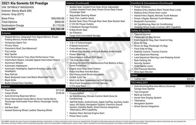 Ebony Black 2021 Kia Sorento SX-Prestige FWD 8-Speed DCT 2.5L I4 DGI Turbocharged DOHC 16V LEV3-ULEV70 281hp WE DELIVER ANYWHERE, 12 Speakers, 3.316 Axle Ratio, 3rd row seats: split-bench, 4-Wheel Disc Brakes, ABS brakes, Air Conditioning, Alloy wheels, AM/FM radio: SiriusXM, Apple CarPlay & Android Auto, Auto Dimming Mirror w/HomeLink (Plug-N-Play), Auto High-beam Headlights, Auto-dimming Rear-View mirror, Automatic temperature control, Brake assist, Bumpers: body-color, Cargo Cover, Cargo Net, Carpeted Floor Mats, Delay-off headlights, Driver door bin, Driver vanity mirror, Dual front impact airbags, Dual front side impact airbags, Electronic Stability Control, Emergency communication system: UVO link, Four wheel independent suspension, Front anti-roll bar, Front Bucket Seats, Front Center Armrest, Front dual zone A/C, Front fog lights, Front reading lights, Fully automatic headlights, Heated & Ventilated Front Bucket Seats, Heated door mirrors, Heated front seats, Heated steering wheel, Illuminated entry, Knee airbag, Leather steering wheel, Low tire pressure warning, Navigation System, Occupant sensing airbag, Outside temperature display, Overhead airbag, Overhead console, Panic alarm, Passenger door bin, Passenger vanity mirror, Perforated Genuine Leather Seat Trim, Power door mirrors, Power driver seat, Power Liftgate, Power moonroof, Power passenger seat, Power steering, Power windows, Radio data system, Radio: AM/FM Bose Audio System w/Navigation, Rear air conditioning, Rear anti-roll bar, Rear reading lights, Rear window defroster, Rear window wiper, Remote keyless entry, Roof rack: rails only, Security system, Smart Key w/ Push Button and Remote Start, Speed control, Speed-sensing steering, Split folding rear seat, Spoiler, Steering wheel mounted audio controls, Tachometer, Telescoping steering wheel, Tilt steering wheel, Traction control, Trip computer, Turn signal indicator mirrors, Variably intermittent wipers, Ventilated front seats, Wheel Locks, Wheels: 20 Gloss Black Alloy.