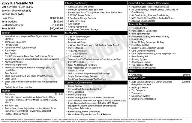 Ebony Black 2022 Kia Sorento SX FWD 8-Speed DCT 2.5L I4 DGI Turbocharged DOHC 16V LEV3-ULEV70 281hp WE DELIVER ANYWHERE, 3.316 Axle Ratio, 3rd row seats: split-bench, 4-Wheel Disc Brakes, 6 Speakers, ABS brakes, Air Conditioning, Alloy wheels, AM/FM radio: SiriusXM, Apple CarPlay & Android Auto, Auto High-beam Headlights, Automatic temperature control, Brake assist, Bumpers: body-color, Cargo Net, Carpeted Floor Mats, Delay-off headlights, Driver door bin, Driver vanity mirror, Dual front impact airbags, Dual front side impact airbags, EC Mirror w/HomeLink, Electronic Stability Control, Emergency communication system: UVO Link, Exterior Parking Camera Rear, Four wheel independent suspension, Front anti-roll bar, Front Bucket Seats, Front Center Armrest, Front dual zone A/C, Front fog lights, Front reading lights, Fully automatic headlights, Heated door mirrors, Heated Front Bucket Seats, Heated front seats, Illuminated entry, Knee airbag, Leather steering wheel, Low tire pressure warning, Navigation System, Occupant sensing airbag, Outside temperature display, Overhead airbag, Overhead console, Panic alarm, Passenger door bin, Passenger vanity mirror, Power door mirrors, Power driver seat, Power Liftgate, Power moonroof, Power passenger seat, Power steering, Power windows, Radio data system, Radio: AM/FM Audio System, Rear air conditioning, Rear anti-roll bar, Rear reading lights, Rear window defroster, Rear window wiper, Remote keyless entry, Roof rack: rails only, Security system, Smart Key w/ Push Button and Remote Start, Speed control, Speed-sensing steering, Split folding rear seat, Spoiler, Steering wheel mounted audio controls, SynTex Artificial Leather Seat Trim, Tachometer, Telescoping steering wheel, Tilt steering wheel, Traction control, Trip computer, Turn signal indicator mirrors, Variably intermittent wipers, Wheels: 8.5J x 20 Gloss Black Alloy.