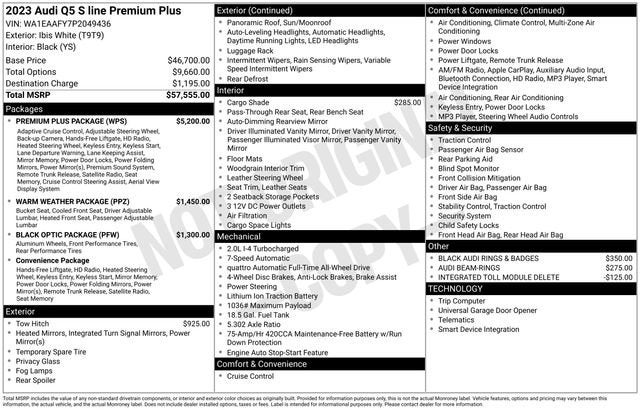 This Q5 is equipped with a host of premium features that elevate the driving experience. The PREMIUM PLUS PACKAGE includes a Bang & Olufsen Sound System with 3D Sound, a Top View Camera System, and Audi Virtual Cockpit Plus, among other luxurious amenities. The WARM WEATHER PACKAGE adds ventilated front sport seats and manual rear side window sunshades, while the BLACK OPTIC PACKAGE enhances the vehicle's sleek appearance with 20-inch bi-color wheels, black exterior trim, and black roof rails.