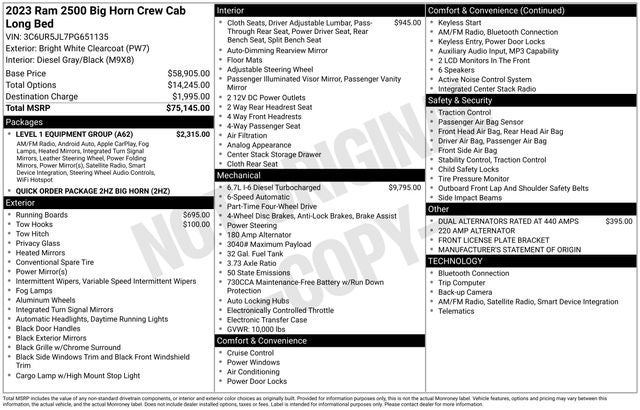 Bright White Clearcoat 2023 Ram 2500 Big Horn 4WD 6-Speed Automatic Cummins 6.7L I6 Turbodiesel WE DELIVER ANYWHERE, 2 Way Rear Headrest Seat, 220 Amp Alternator, 2nd Row In Floor Storage Bins, 3.73 Axle Ratio, 4 Way Front Headrests, 4-Wheel Disc Brakes, 40/20/40 Split Bench Seat, 4G LTE Wi-Fi Hot Spot, 6 Speakers, 8.4 Touchscreen Display, ABS brakes, Active Noise Control System, Air Conditioning, Alloy wheels, Apple CarPlay, Auto Power-Folding Mirrors, Auto-dimming Rear-View mirror, Big Horn IP Badge, Black Exterior Mirrors, Bluetooth® Handsfree Phone & Audio, Brake assist, Bumpers: chrome, Center Hub, Center Stack Storage Drawer, Chrome Flat Cab-Length Side Steps, Cloth 40/20/40 Bench Seat, Compass, Connectivity - US/Canada, Delay-off headlights, Driver door bin, Dual Alternators Rated At 440 Amps, Dual front impact airbags, Dual front side impact airbags, Dual Glove Boxes, Electronic Stability Control, Electronically Controlled Throttle, Emergency communication system: SiriusXM Guardian, Exterior Mirrors Courtesy Lamps, Exterior Mirrors w/Heating Element, Exterior Mirrors w/Supplemental Signals, Foam Bottle Insert (Door Trim Panel), Footwell Courtesy Lamp, For Details, Visit DriveUconnect.com, For More Info, Call 800-643-2112, Forward & Reverse Utility Lights, Front anti-roll bar, Front Armrest w/Cupholders, Front Center Armrest w/Storage, Front Center Seat Cushion Storage, Front Fog Lamps, Front License Plate Bracket, Front reading lights, Front Seat Back Map Pockets, Fully automatic headlights, Global Telematics Box Module (TBM), Glove Box Lamp, Google Android Auto, GPS Antenna Input, Heated door mirrors, Illuminated entry, Integrated Center Stack Radio, Integrated Voice Command w/Bluetooth®, Leather Wrapped Steering Wheel, Level 1 Equipment Group, Locking Lower Glove Box, Low tire pressure warning, Manual Adjust 4-Way Driver Seat, Manual Adjust 4-Way Front Passenger Seat, Manufacturer's Statement of Origin, Mirror Running Lights, Occupant sensing airbag, Outside temperature display, Overhead airbag, Overhead console, Panic alarm, ParkView Rear Back-Up Camera, Passenger door bin, Passenger vanity mirror, Power 2-Way Driver Lumbar Adjust, Power Adjust 8-Way Driver Seat, Power Adjust Mirrors, Power Adjustable Convex Aux Mirrors, Power door mirrors, Power Heated Fold Telescope Mirrors, Power steering, Power Telescoping Mirrors, Power windows, Premium Cloth 40/20/40 Bench Seat, Quick Order Package 2HZ Big Horn, Radio data system, Radio: Uconnect 3 w/5 Display, Radio: Uconnect 5 W w/8.4 Display, Rear 60/40 Folding Seat, Rear anti-roll bar, Rear Dome w/On/Off Switch Lamp, Rear Folding Seat, Rear seat center armrest, Rear step bumper, Remote keyless entry, Selectable Tire Fill Alert, SiriusXM Radio Service, SiriusXM Satellite Radio, Speed control, Steering Wheel Mounted Audio Controls, Storage Tray, Tachometer, Tilt steering wheel, Tip Start, Tow Hooks, Traction control, Trip computer, Turn signal indicator mirrors, Variably intermittent wipers, Voltmeter, Wheels: 18 x 8.0 Polished Aluminum.