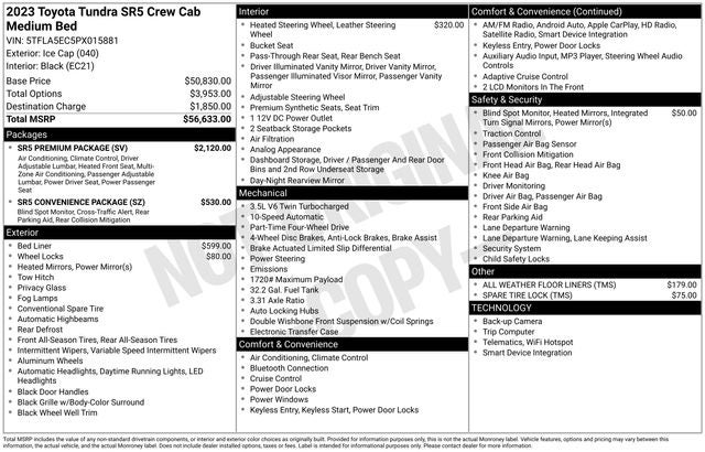 This Tundra SR5 is the perfect blend of capability, comfort, and convenience. With an EPA-estimated 17 city/23 highway MPG, it offers impressive fuel efficiency for a full-size pickup. The spacious cabin provides ample room for passengers and cargo, while the extensive list of advanced safety features, including Blind Spot Monitor and Parking Support Brake, help keep you and your loved ones secure on the road.