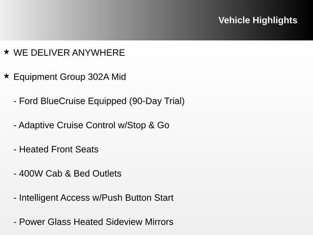 - EQUIPMENT GROUP 302A MID: Includes Adaptive Cruise Control w/Stop & Go, lane centering, Speed Sign Recognition, Intelligent Access w/Push Button Start, 400W Cab & Bed Outlets, Ford BlueCruise Equipped (90-Day Trial), Power-Sliding Rear Window, Remote Start System w/Remote Tailgate Release, Heated Front Seats, Power Glass Heated Sideview Mirrors