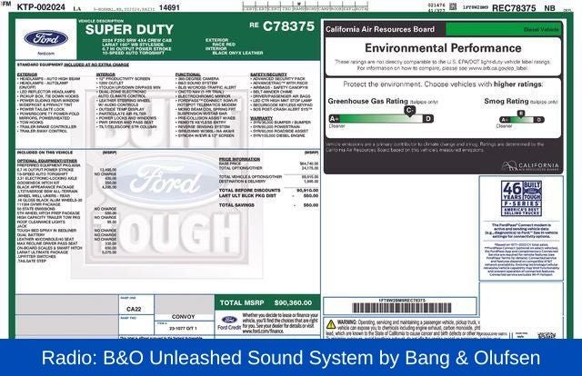 Race Red 2024 Ford F-250SD Lariat HO Ultimate 4WD 10-Speed Automatic 6.7L High Output Power Stroke V8 Diesel 4WD, 4-Way Adjustable Headrests, 5th Wheel/Gooseneck Hitch Prep Package, 6 Ebony Black Angular Running Boards, ABS brakes, Alloy wheels, Black Appearance Package, Body Color Front & Rear Bumpers, Compass, Ebony Black Painted Front Grille Bars, Ebony Black Painted Mirror Caps, Electronic Stability Control, Electronic-Locking w/3.31 Axle Ratio, Front dual zone A/C, Front Sensing System, Gooseneck Hitch Kit (Pre-Installed), Head-Up Display, Heated door mirrors, Heated front seats, Heated rear seats, Illuminated entry, Intelligent Adaptive Cruise Control w/Stop-and-Go, Lariat Ultimate Package, Low tire pressure warning, Onboard Scales & Smart Hitch, Pro Trailer Backup Assist, Pro Trailer Hitch Assist, Radio: B&O Unleashed Sound System by Bang & Olufsen, Rear Wheel Well Liners (Pre-Installed), Remote keyless entry, Tailgate Step & Handle, Tough Bed Spray-In Bedliner, Traction control, Upfitter Switches (6), Wheels: 20 Machined & Ebony Black High Gloss, Wireless Charging Pad.