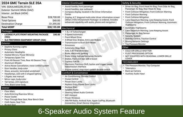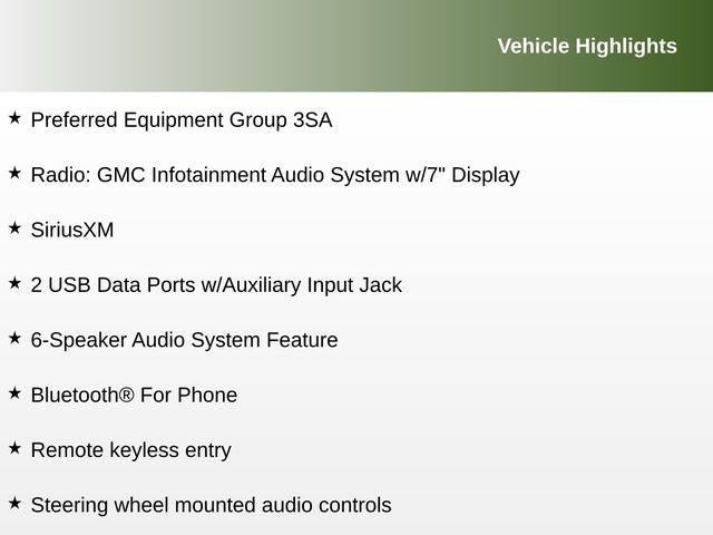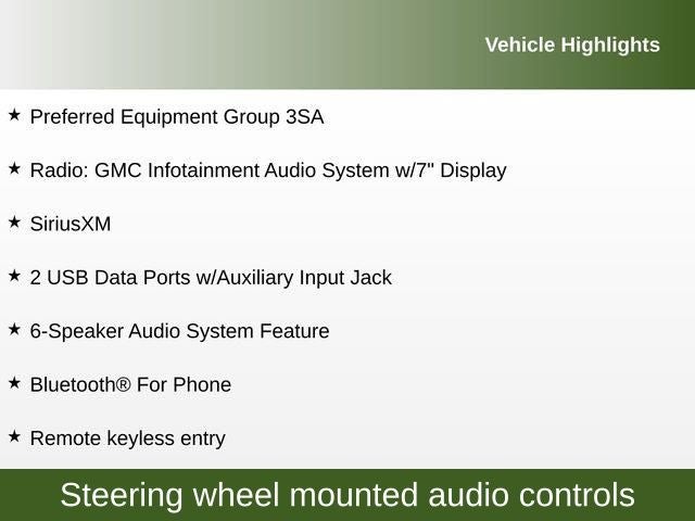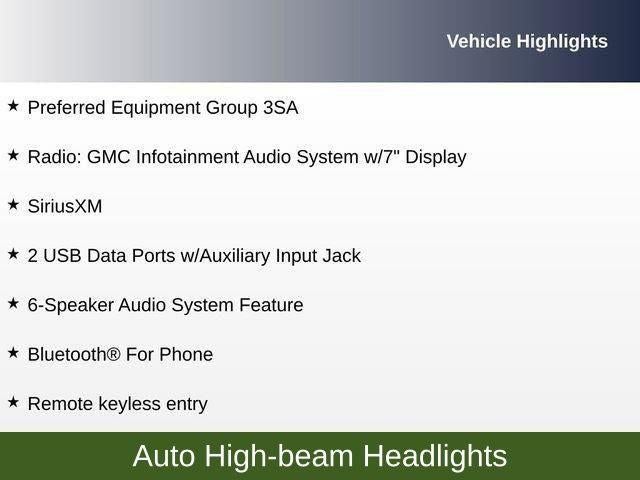 2 USB Data Ports w/Auxiliary Input Jack, 4.2 Multi-Color Driver Information Screen, 6-Speaker Audio System Feature, Alloy wheels, Auto High-beam Headlights, Bluetooth® For Phone, Emergency communication system: OnStar and GMC connected services capable, Fully automatic headlights, Heated door mirrors, Illuminated entry, Panic alarm, Preferred Equipment Group 3SA, Premium Cloth Seat Trim, Radio: GMC Infotainment Audio System w/7 Display, Remote keyless entry, Security system, SiriusXM, Steering wheel mounted audio controls, Wheels: 17 x 7 Silver Painted Aluminum, Wireless Apple CarPlay/Wireless Android Auto.