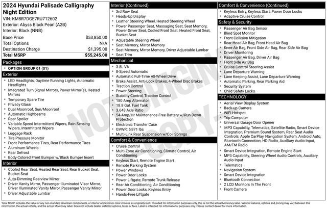 Abyss Black Pearl 2024 Hyundai Palisade Calligraphy Night Edition AWD 8-Speed Automatic with SHIFTRONIC V6 12 Speakers, 3.648 Axle Ratio, 3rd row seats: split-bench, 4-Wheel Disc Brakes, ABS brakes, Air Conditioning, Alloy wheels, AM/FM radio: SiriusXM, Apple CarPlay & Android Auto, Auto High-beam Headlights, Auto-dimming door mirrors, Auto-dimming Rear-View mirror, Auto-leveling suspension, Automatic temperature control, Brake assist, Bumpers: body-color, Compass, Delay-off headlights, Driver door bin, Driver vanity mirror, Dual front impact airbags, Dual front side impact airbags, Electronic Stability Control, Emergency communication system, Exterior Parking Camera Rear, Four wheel independent suspension, Front anti-roll bar, Front Bucket Seats, Front Center Armrest, Front dual zone A/C, Front reading lights, Fully automatic headlights, Garage door transmitter: HomeLink, harman/kardon® Speakers, Heads-Up Display, Heated & Ventilated Front Bucket Seats, Heated door mirrors, Heated front seats, Heated rear seats, Heated steering wheel, Illuminated entry, Knee airbag, Low tire pressure warning, Memory seat, Microfiber Suede Seat Trim, Navigation System, Occupant sensing airbag, Option Group 01, Outside temperature display, Overhead airbag, Overhead console, Panic alarm, Passenger door bin, Passenger vanity mirror, Power door mirrors, Power driver seat, Power Liftgate, Power moonroof, Power passenger seat, Power steering, Power windows, Radio data system, Radio: AM/FM/MP3 Premium Audio System, Rain sensing wipers, Rear air conditioning, Rear anti-roll bar, Rear audio controls, Rear reading lights, Rear side impact airbag, Rear window defroster, Rear window wiper, Reclining 3rd row seat, Remote keyless entry, Roof rack, Security system, Speed control, Speed-sensing steering, Split folding rear seat, Spoiler, Steering wheel mounted audio controls, Tachometer, Telescoping steering wheel, Tilt steering wheel, Traction control, Trip computer, Turn signal indicator mirrors, Variably intermittent wipers, Ventilated front seats, Ventilated rear seats, Wheels: 20 x 7.5J Black Liquid Paint Alloy.