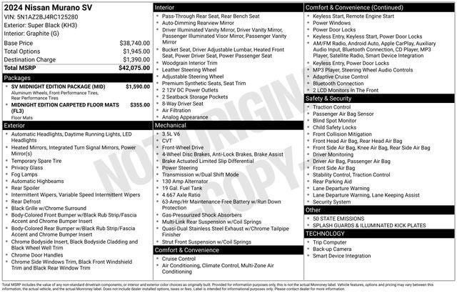 4-Wheel Disc Brakes, 4.667 Axle Ratio, 6 Speakers, ABS brakes, Air Conditioning, Alloy wheels, AM/FM radio: SiriusXM, AM/FM/CD/MP3/WMA Audio System, Auto High-beam Headlights, Auto-dimming Rear-View mirror, Automatic temperature control, Black Splash Guards, Blind Spot Warning, Brake assist, Bumpers: body-color, CD player, Child-Seat-Sensing Airbag, Compass, Delay-off headlights, Driver door bin, Driver vanity mirror, Dual front impact airbags, Dual front side impact airbags, Electronic Stability Control, Four wheel independent suspension, Front anti-roll bar, Front Bucket Seats, Front Center Armrest, Front dual zone A/C, Front fog lights, Front reading lights, Fully automatic headlights, Heated door mirrors, Heated Front Bucket Seats, HEATED FRONT SEATS, Illuminated entry, Illuminated Kickplates, Knee airbag, Leather steering wheel, Leatherette-Appointed Seat Trim, Low tire pressure warning, Midnight Edition Badge, Midnight Edition Carpeted Floor Mats, NissanConnect featuring Apple CarPlay and Android Auto, Occupant sensing airbag, Outside temperature display, Overhead airbag, Overhead console, Panic alarm, Passenger door bin, Passenger vanity mirror, Power door mirrors, Power driver seat, Power passenger seat, Power steering, Power windows, Radio data system, Rear anti-roll bar, Rear reading lights, Rear seat center armrest, Rear side impact airbag, Rear window defroster, Rear window wiper, Remote keyless entry, Security system, Speed control, Speed-sensing steering, Speed-Sensitive Wipers, Splash Guards & Illuminated Kick Plates, Split folding rear seat, Spoiler, Steering wheel mounted audio controls, SV Midnight Edition Package, Tachometer, Telescoping steering wheel, Tilt steering wheel, Traction control, Trip computer, Turn signal indicator mirrors, Variably intermittent wipers, Wheels: 18 Machined Aluminum-Alloy, Wheels: 20 Gloss Black Aluminum Alloy.