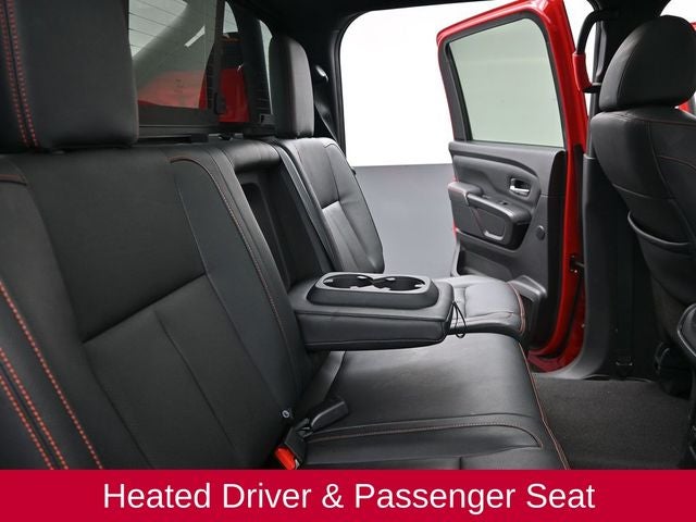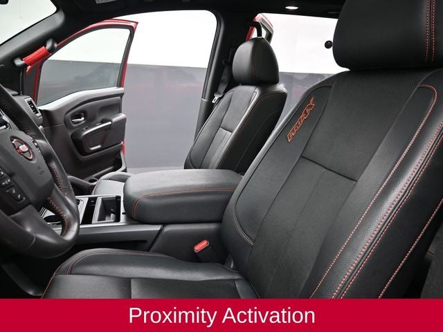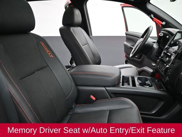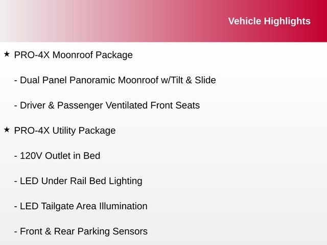 120V Outlet in Bed, 4-Way Power Assist Seat, Driver & Passenger Ventilated Front Seats, Driver Power Folding Auto Dimming Outside Mirrors, Dual Panel Panoramic Moonroof w/Tilt & Slide, Front & Rear Parking Sensors, Heated Driver & Passenger Seat, Heated Rear Seats, Heated Tilt/Telescoping Steering Wheel, Intelligent Around View Monitor (I-AVM), Leather Seat Trim, LED Tailgate Area Illumination, LED Under Rail Bed Lighting, Memory Driver Seat w/Auto Entry/Exit Feature, PRO-4X Convenience Package, PRO-4X Moonroof Package, PRO-4X Utility Package, Proximity Activation, Remote Engine Start on Key Fob, Side Turn Signal Lamps on Mirror Housing, Trailer Light Check Function On Key Fob, Utilitrack System w/2 Tie-Down Cleats.