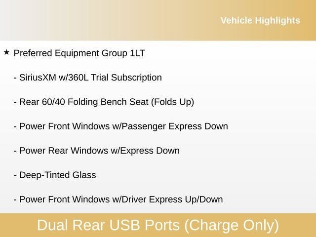 - Convenience Package includes (CJ2) dual-zone automatic climate control, (A2X) 10-way power driver seat including power lumbar, (KA1) heated driver and passenger seats, (N57) wrapped steering wheel, (KI3) heated steering wheel, (KI4) 120-volt power outlet, (KC9) 120-volt bed-mounted power outlet, (UBI) 2 charge-only USB ports for second row, (C49) rear-window defogger, (AVJ) Keyless Open and Start, (BTV) Remote Start, (UTJ) content theft alarm, (N37) Steering column, manual tilt and telescoping and (UF2) LED Cargo Area Lighting (Upgradeable to (A50) bucket seats and includes (D07) center console. Some content is deleted when (RG4) Fleet LT Base Content Package Delete is ordered. The deleted content is as follows; (CJ2) Air conditioning, (A2X) Seat adjuster, (KA1) Seating, heated driver and front outboard passenger, (KI3) Steering wheel, heated, (N37) Steering column, manual tilt and telescoping, and (UF2) LED Cargo Area Lighting.)