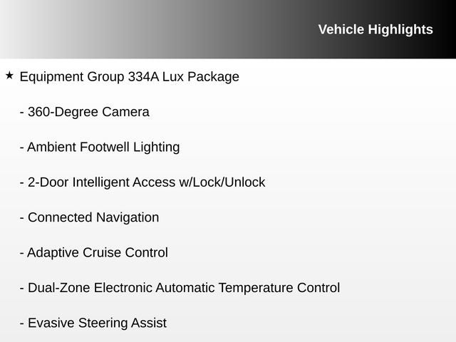 2-Door Intelligent Access w/Lock/Unlock, 360-Degree Camera, 4.7 Final Drive Ratio, Adaptive Cruise Control, Ambient Footwell Lighting, Black Appearance Package, Black Molded-In-Color Door Handles, Black Molded-In-Color Fender Flares, Black Molded-In-Color Sideview Mirror Caps, Black-Painted Molded-In-Color Grille, Connected Navigation, Dr & Pass Illuminated Sliding Visor Vanity Mirrors, Dual Smart Charging USB Ports, Dual-Zone Electronic Automatic Temperature Control, Equipment Group 334A Lux Package, Evasive Steering Assist, Front Parking Sensors, Front Row Heated Seats, High Clearance Fender Flares, High Clearance Suspension, Information on Demand Panel, Position-Sensitive Bilstein Shock Absorbers, Power Outlet - Back Side of Center Floor Console, Radio: B&O Sound System by Bang & Olufsen, Rear Parking Sensors, Sasquatch Package, Sideview Mirrors, Universal Garage Door Opener, Wheels: 17 Carbonized Gray Painted Aluminum.