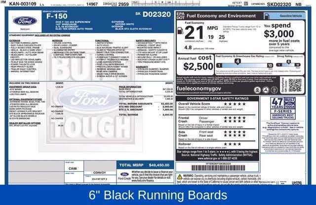 Oxford White 2025 Ford F-150 STX RWD 10-Speed Automatic 2.7L V6 EcoBoost WE DELIVER ANYWHERE, Ford Gold Certified Certified, 20 Wheels, 6 Black Running Boards, Black Exterior Badging, STX Black Appearance Package, Unique Sport Cloth 40/Console/40 Front-Seats, Wheels: 20 Gloss Black, 3.55 Axle Ratio, 4-Wheel Disc Brakes, 6 Speakers, ABS brakes, Air Conditioning, Alloy wheels, AM/FM radio: SiriusXM with 360L, Auto High-beam Headlights, Brake assist, Bumpers: body-color, Compass, Delay-off headlights, Driver door bin, Dual front impact airbags, Dual front side impact airbags, Electronic Stability Control, Emergency communication system: SYNC 4 911 Assist, Equipment Group 200A Mid, Front anti-roll bar, Front Bucket Seats, Front Center Armrest, Front License Plate Bracket, Front reading lights, Front wheel independent suspension, Fully automatic headlights, GVWR: 6,426 lbs Payload Package, Heated door mirrors, Illuminated entry, Internet access capable: FordPass Connect 5G, LED Fog Lamps w/LED Cornering Lamp, Low tire pressure warning, Occupant sensing airbag, Outside temperature display, Overhead airbag, Overhead console, Panic alarm, Passenger door bin, Passenger vanity mirror, Power door mirrors, Power steering, Power windows, Radio data system, Radio: AM/FM Stereo w/SiriusXM 360L, Rear Parking Sensors, Rear step bumper, Rear window defroster, Remote keyless entry, Security system, Speed control, Split folding rear seat, Steering wheel mounted audio controls, SYNC 4 w/Enhanced Voice Recognition, Tachometer, Telescoping steering wheel, Tilt steering wheel, Traction control, Trip computer, Variably intermittent wipers, Voltmeter, Wheels: 18 Gloss Black, Wheels: 20 Dark Gray w/Machined Aluminum, 20 Wheels, 6 Black Running Boards, Black Exterior Badging, STX Black Appearance Package, Unique Sport Cloth 40/Console/40 Front-Seats, Wheels: 20 Gloss Black.