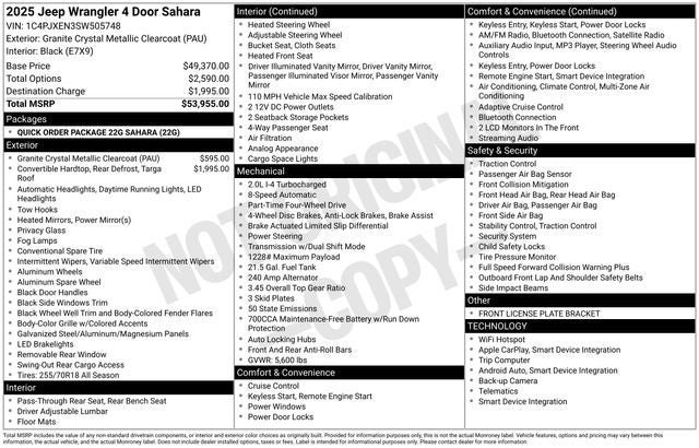 This Wrangler Sahara is packed with a wealth of premium features that elevate your driving experience. Enjoy the convenience of Apple CarPlay, Google Android Auto, and the Uconnect 5 infotainment system with a large 12.3 display. Stay comfortable with dual-zone automatic climate control, a heated steering wheel, and heated front seats. Safety is also a priority, with features like Brake Assist, Electronic Stability Control, and a ParkView Rear Back-Up Camera.