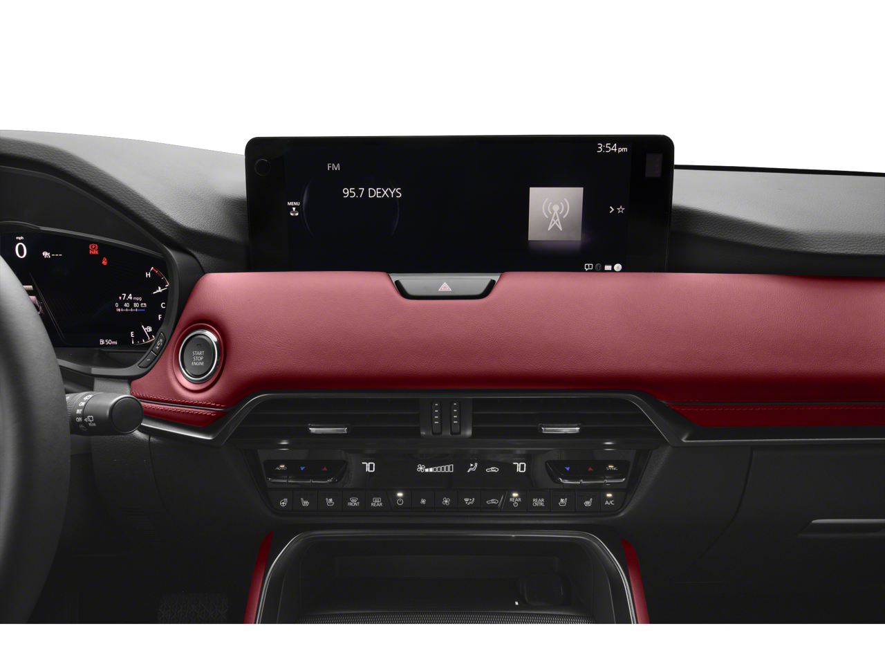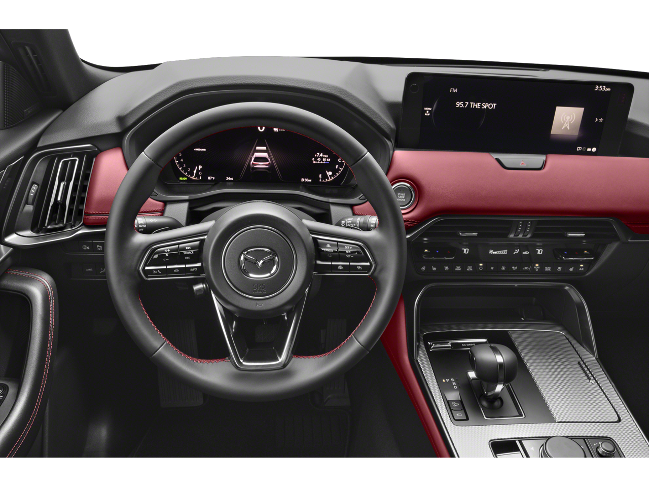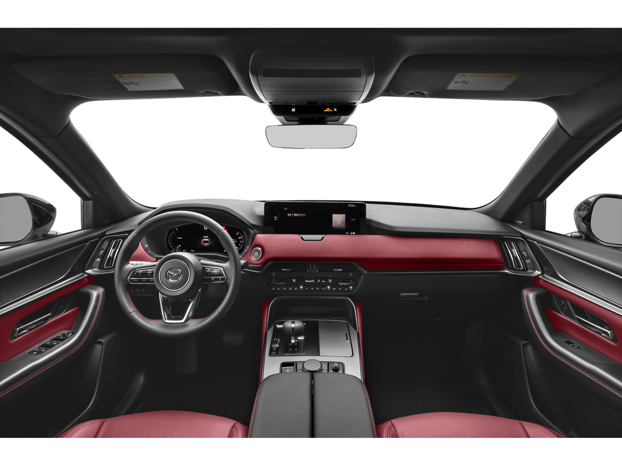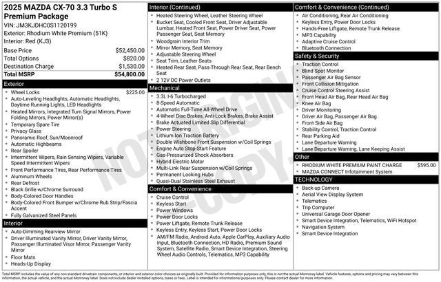 12 Speakers, 4-Wheel Disc Brakes, ABS brakes, Air Conditioning, Alloy wheels, AM/FM radio: SiriusXM, Auto High-beam Headlights, Auto-dimming door mirrors, Auto-dimming Rear-View mirror, Automatic temperature control, Black Lug Nuts & Black Wheel Locks, Brake assist, Bumpers: body-color, Compass, Delay-off headlights, Driver door bin, Driver vanity mirror, Dual front impact airbags, Dual front side impact airbags, E911 Automatic Emergency Notification, Electronic Stability Control, Emergency communication system: MAZDA CONNECT, Four wheel independent suspension, Front anti-roll bar, Front Bucket Seats, Front Center Armrest w/Storage, Front dual zone A/C, Front reading lights, Fully automatic headlights, Garage door transmitter: HomeLink, Heads-Up Display, Heated door mirrors, Heated front seats, Heated rear seats, Heated steering wheel, Heated/Ventilated Front Bucket Seats, Illuminated entry, Infotainment System Voice Command, Knee airbag, Leather Shift Knob, Leather steering wheel, Low tire pressure warning, Mazda Connected Services, Mazda Online Navigation, Memory seat, Nappa Leather Seat Trim, Navigation system: MAZDA CONNECT, Occupant sensing airbag, Outside temperature display, Overhead airbag, Overhead console, Pandora Internet Radio Integration, Panic alarm, Passenger door bin, Passenger vanity mirror, Power door mirrors, Power driver seat, Power Liftgate, Power moonroof, Power passenger seat, Power steering, Power windows, Radio Broadcast Data System Program Information, Radio data system, Radio: AM/FM w/Bose Premium Audio Sound System, Rain sensing wipers, Rear air conditioning, Rear anti-roll bar, Rear reading lights, Rear seat center armrest, Rear window defroster, Rear window wiper, Remote keyless entry, Rhodium White Premium Paint Charge, Security system, SMS Text Msg Audio Delivery & Reply, Speed control, Speed-sensing steering, Split folding rear seat, Spoiler, Steering wheel memory, Steering wheel mounted audio controls, Tachometer, Telescoping steering wheel, Tilt steering wheel, Traction control, Trip computer, Turn signal indicator mirrors, Variably intermittent wipers, Ventilated front seats, Wheels: 21 x 9.5J Aluminum Alloy.