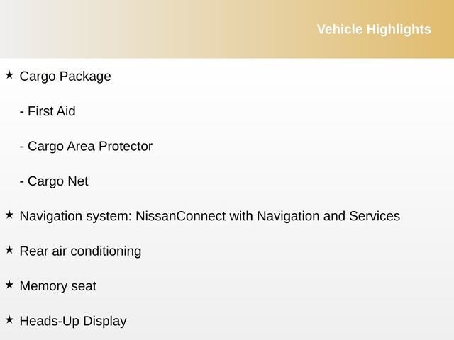 • NissanConnect w/Navigation & Services -inc: door to door connected navigation w/3D building graphics, satellite imagery, online POI search, online premium traffic information and SiriusXM Traffic and Travel Link w/weather, fuel prices, movie listings, stock info, sports and parking