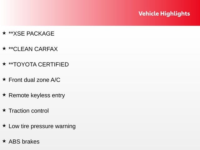 As a Toyota Certified Pre-Owned vehicle, this Camry XSE has undergone a rigorous inspection and reconditioning process, ensuring that it meets the highest standards of quality and reliability. With a clean CARFAX report and a comprehensive warranty, you can purchase this vehicle with confidence, knowing that you're investing in a reliable and well-maintained car.